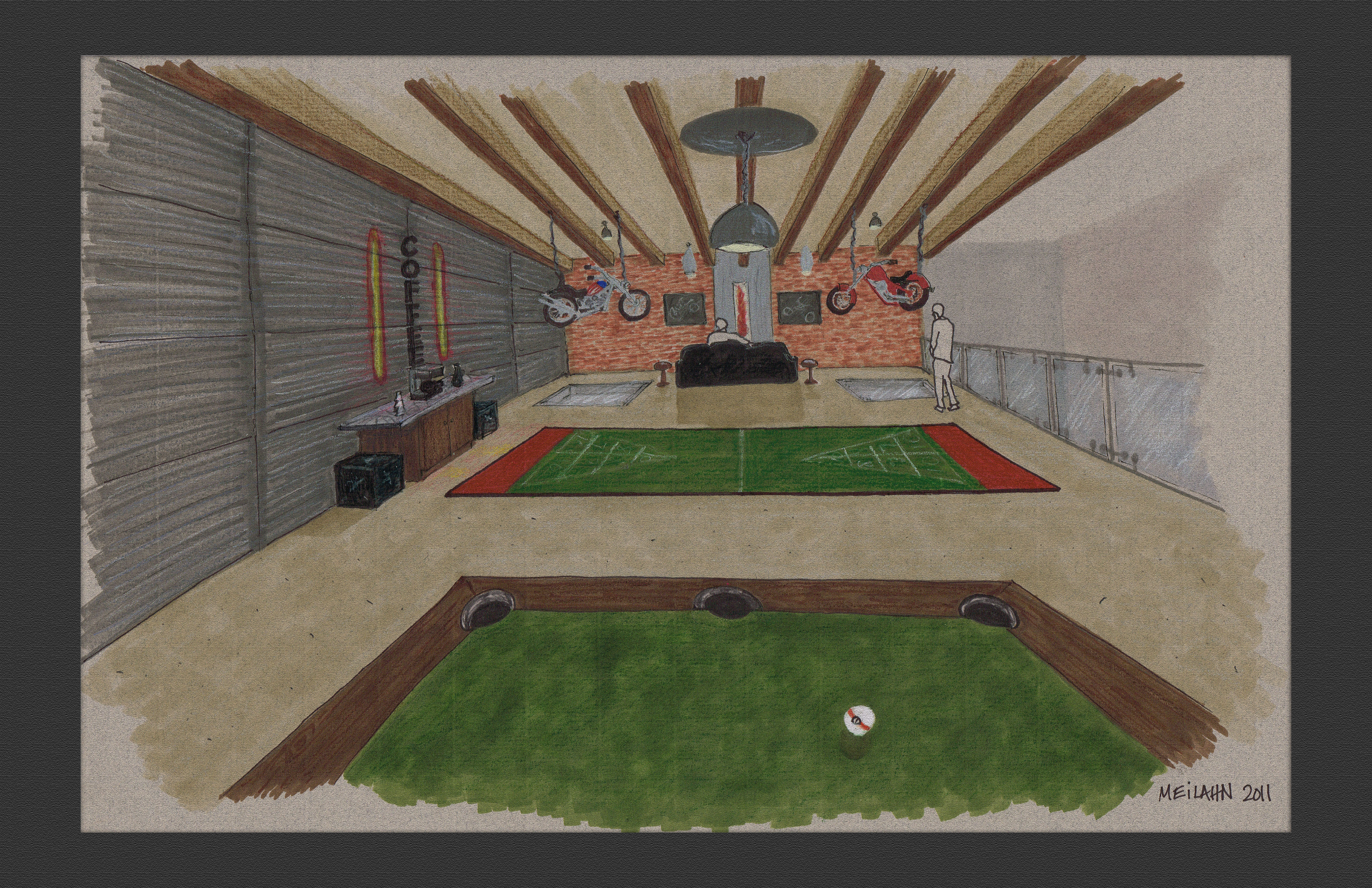 MOTERCYCLE SHOP LOUNGE INTERIOR DESIGN RENDERING, Ink, Marker, Pencil