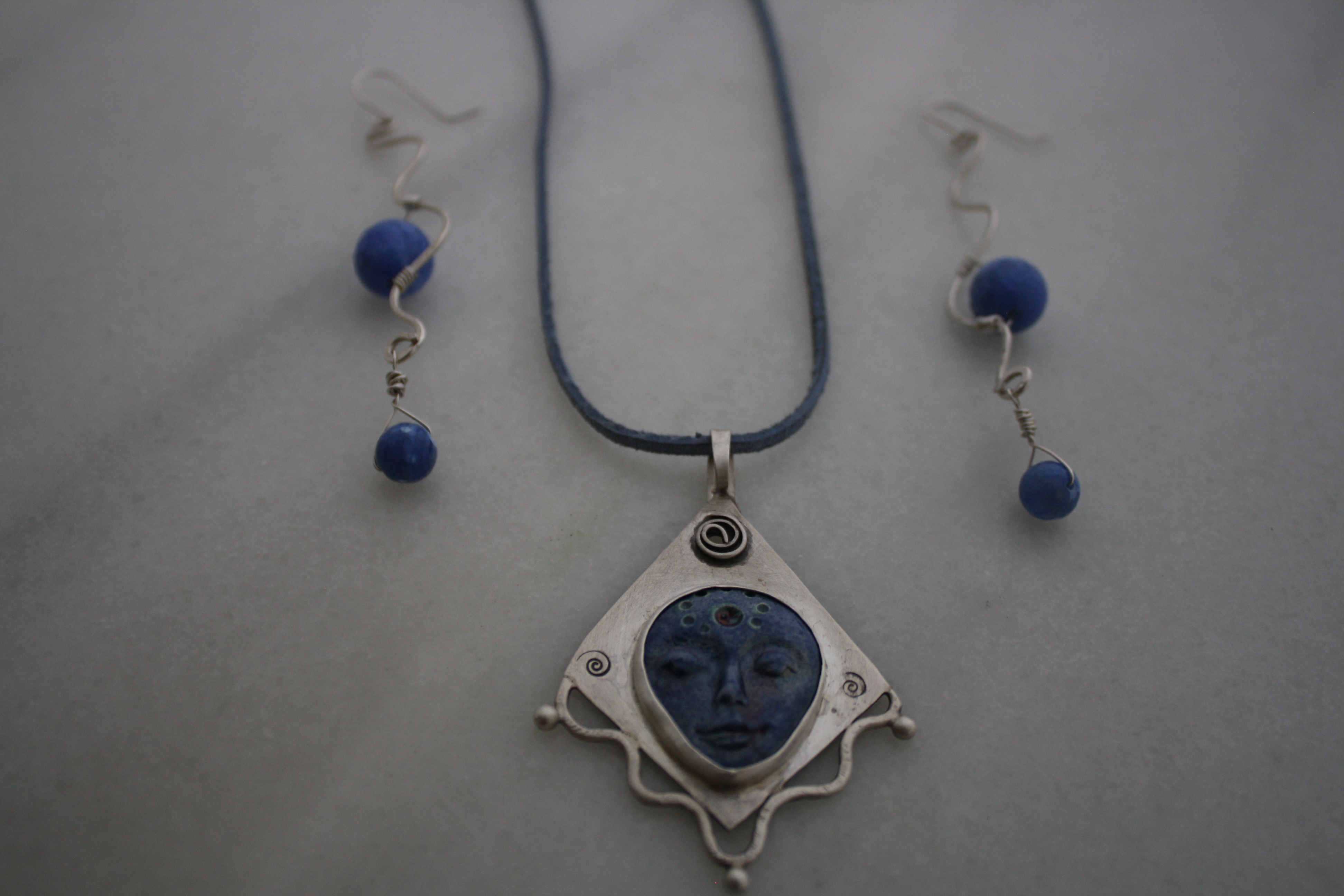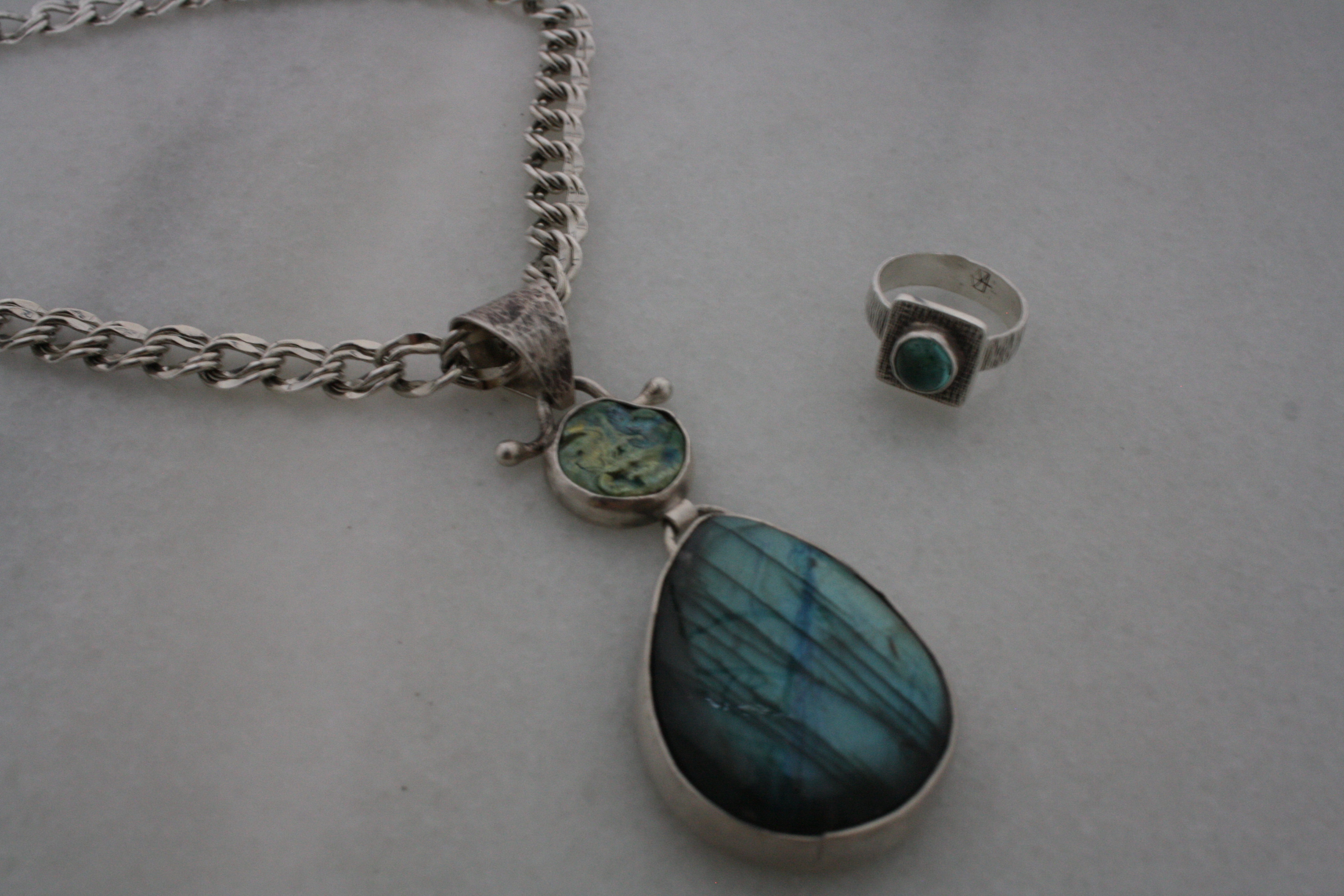 Pendant: Raku Pottery Face, Labradorite, Sterling Silver