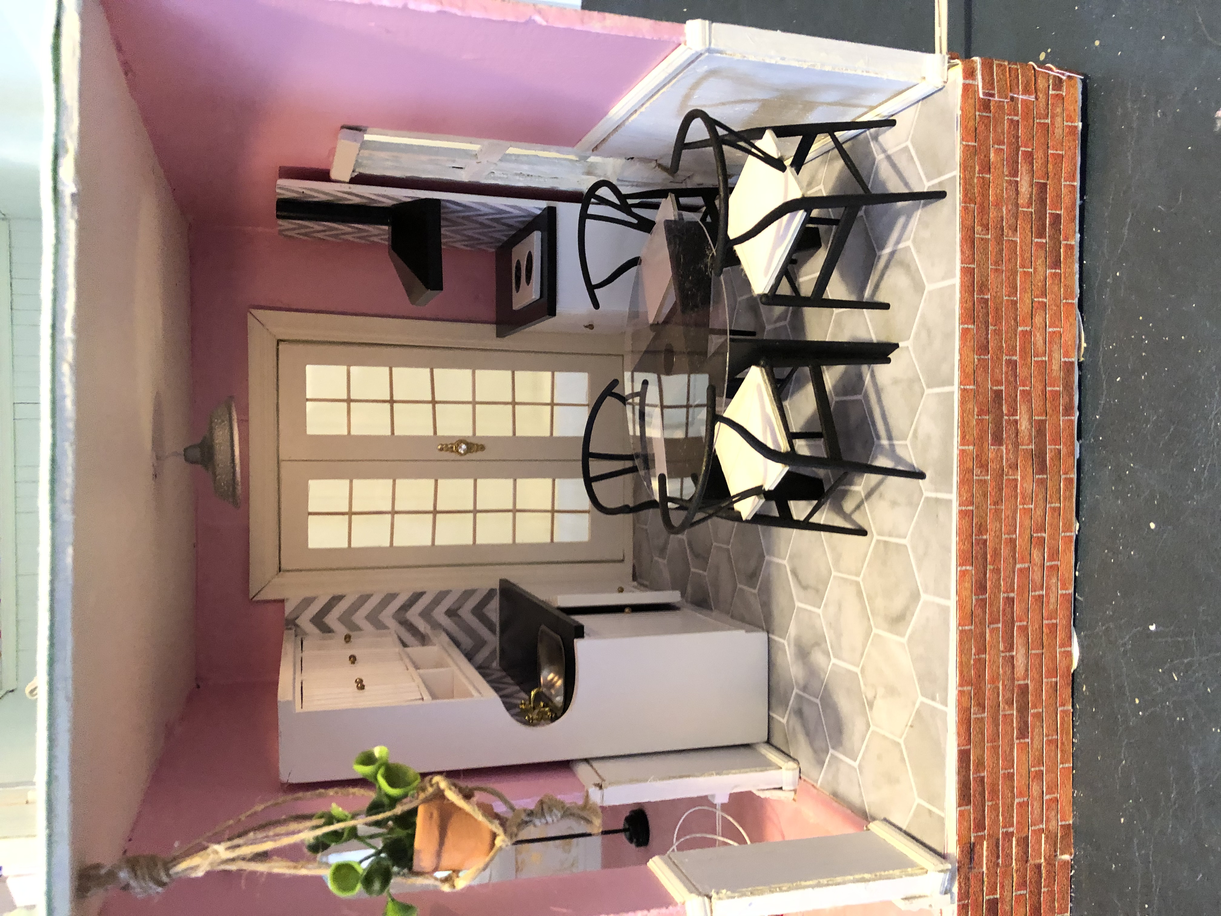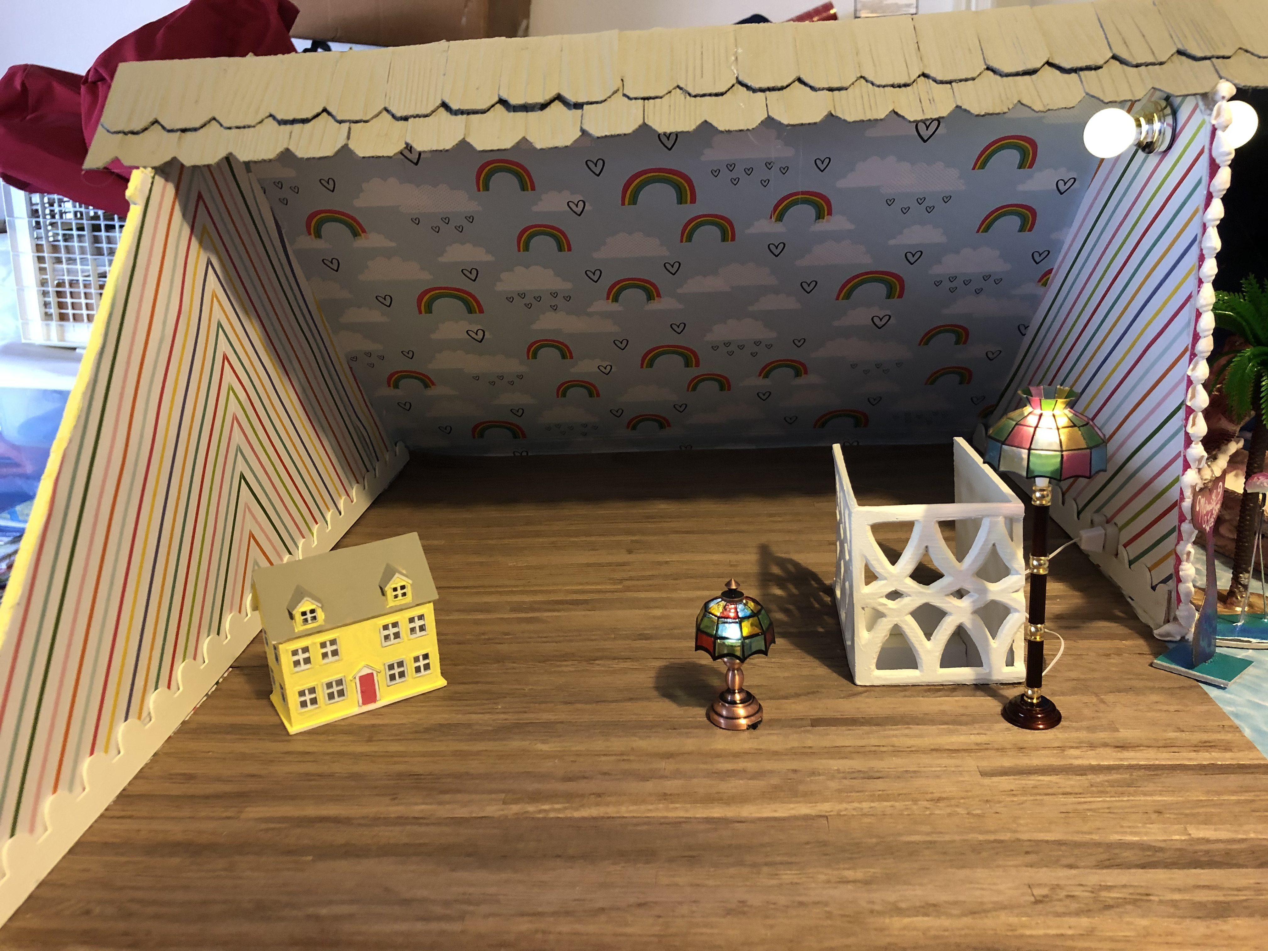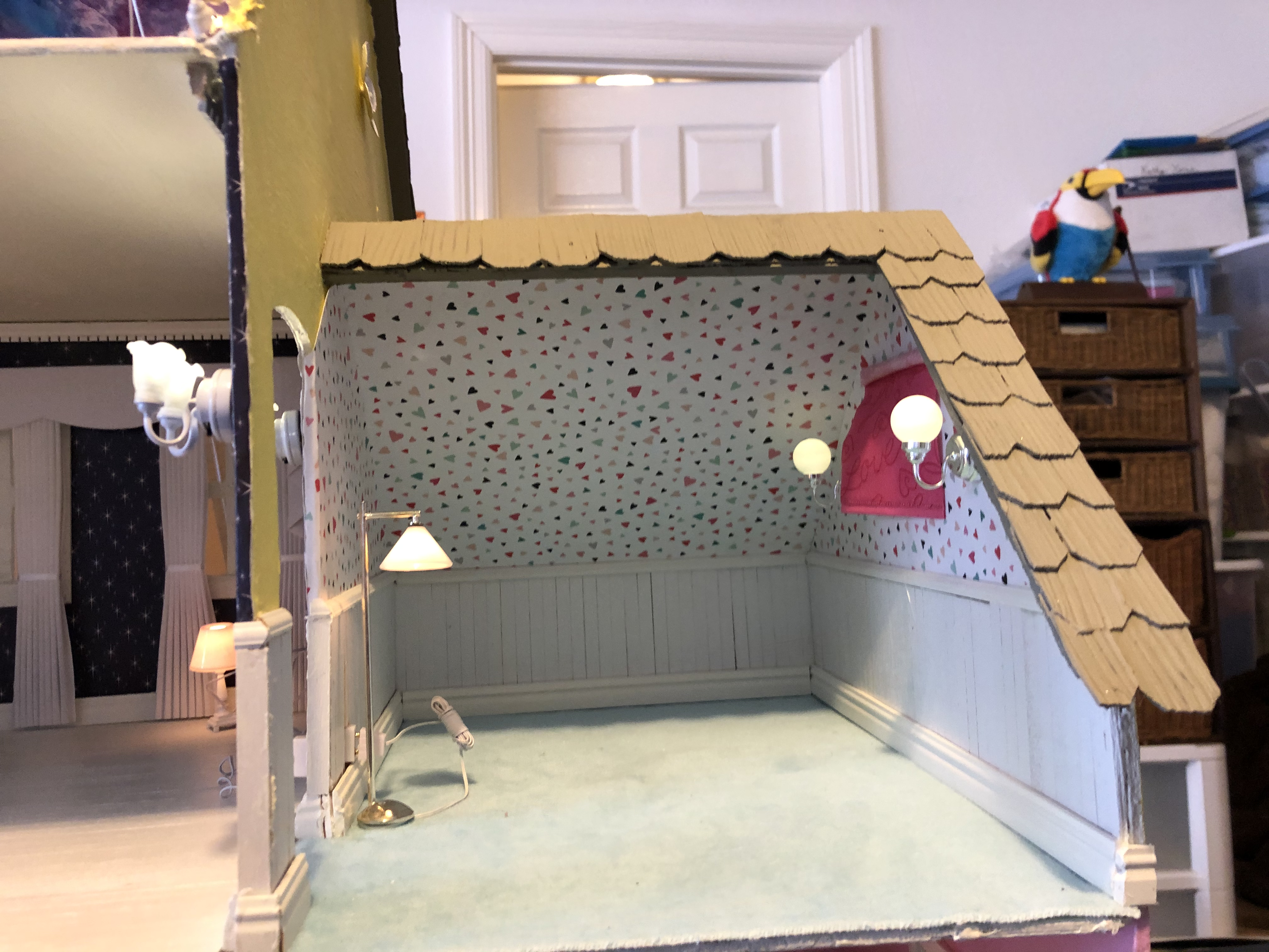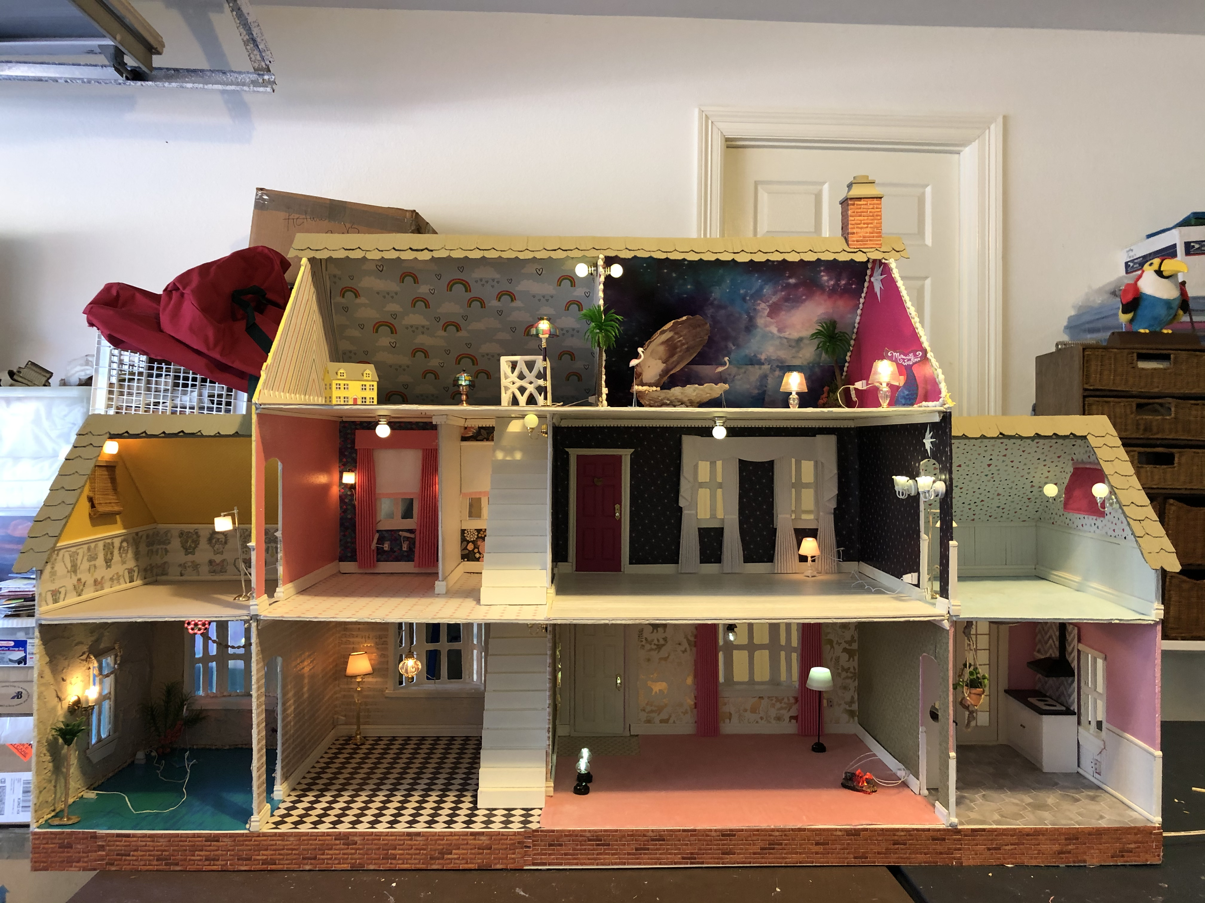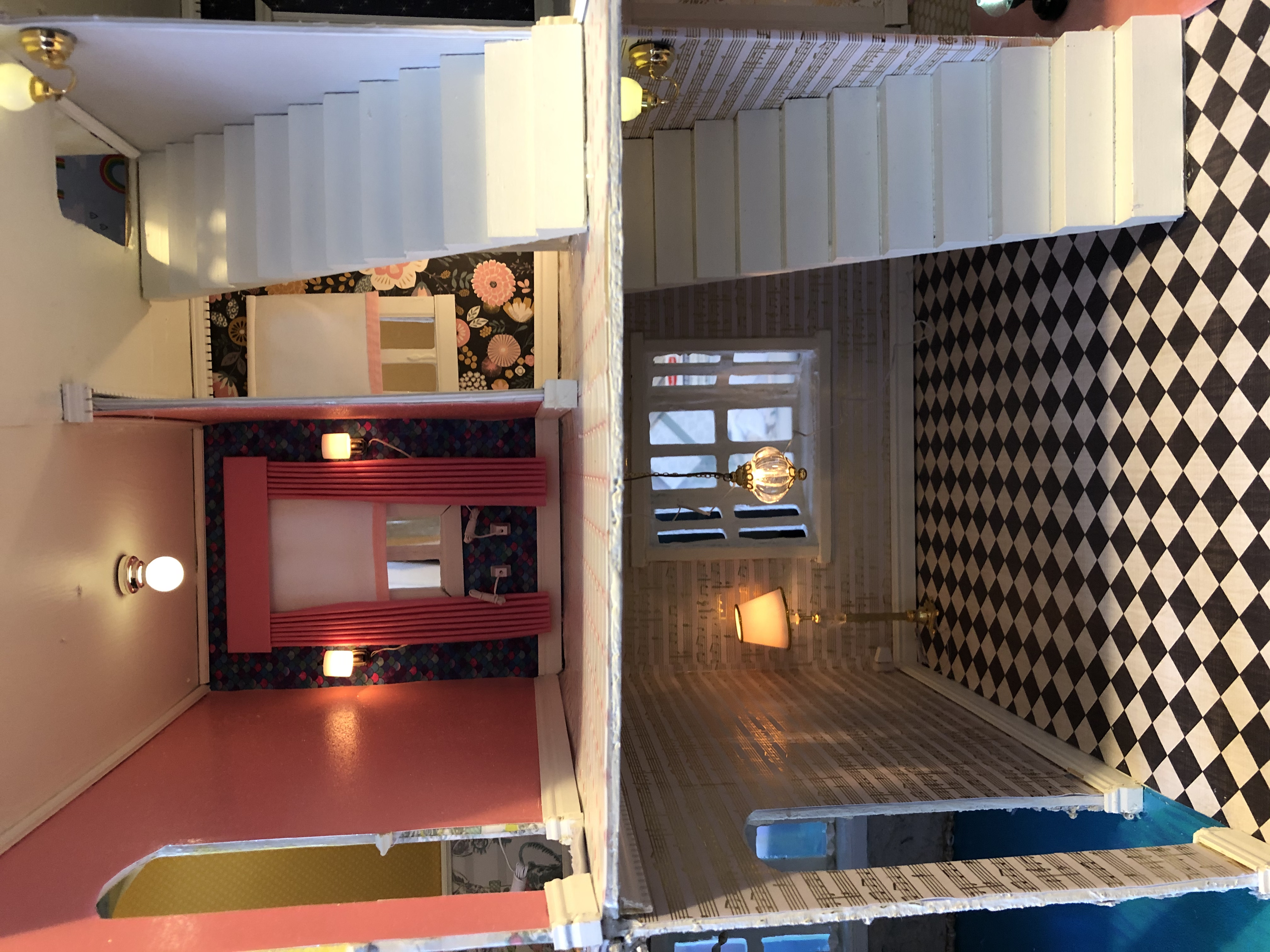 Dollhouse Build, Electrical Wiring, Paint, Glue, Paper, Wood, Fabric, Metal, Mixed Media 2019